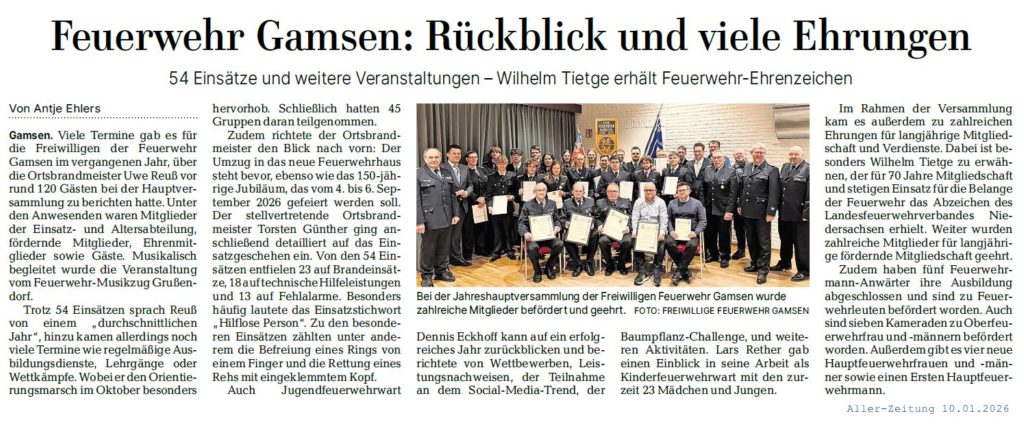 Ortsbrandmeister Uwe Reuß begrüßte rund 120 Gäste (Mitglieder der Einsatz- und Altersabreilung, fördernde Mitglieder, Gäste, Ehrenmitglieder) im Gamsener Dorfgemeinsschaftshaus und eröffnete die Jahreshauptversammlung am 03.01.2026. Für musikalische Unterhaltung sorgte der Feuerwehr-Musikzug Grußendorf.